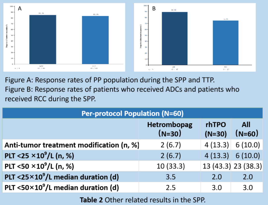 本次大会披露了主要终点二级预防周期(SPP)的结果,在排除6例未能按方案要求接受第二周期抗肿瘤治疗的患者后,共有60例患者完成二级预防阶段的治疗和评估。结果显示,总体治疗应答率为85.0%(51/60)。其中,ADC治疗组与RCC治疗组的应答率分别为89.4%(42/47)和75.0%(9/12)。上述结果提示,海曲泊帕在乳腺癌CTIT二级预防中表现出良好的疗效,尤其在ADC治疗人群中疗效更为突出。特别关注的不良事件为出血及血栓事件。共6例患者报告出血事件,但均为WHO 1级。整个研究期间未观察到任何动脉或静脉血栓事件。