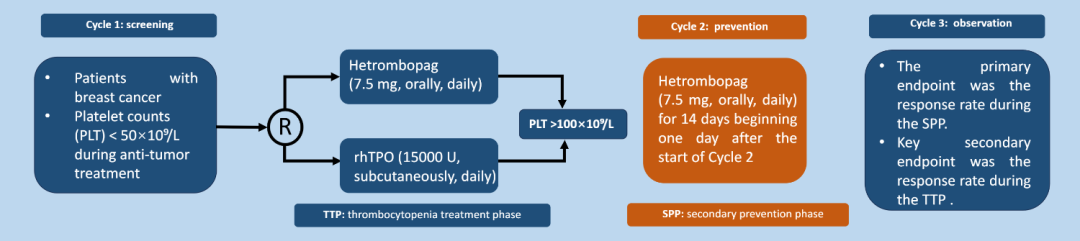 本研究是一项多中心、II期探索性研究,纳入抗肿瘤治疗周期内首次出现血小板计数(PLT)<50×109/L的乳腺癌患者。符合条件的患者1∶1随机分为两组,给与海曲泊帕或重组血小板生成素(rhTPO),直至PLT>100×109/L,此为血小板减少症的治疗阶段(TTP);接下来,所有患者在第2个抗肿瘤治疗周期开始后的第1天起,口服海曲泊帕(起始剂量7.5mg/d)持续14天,此为血小板减少症的二级预防阶段(SPP)。研究的主要终点是第二个抗肿瘤治疗周期SPP升血小板的应答率。