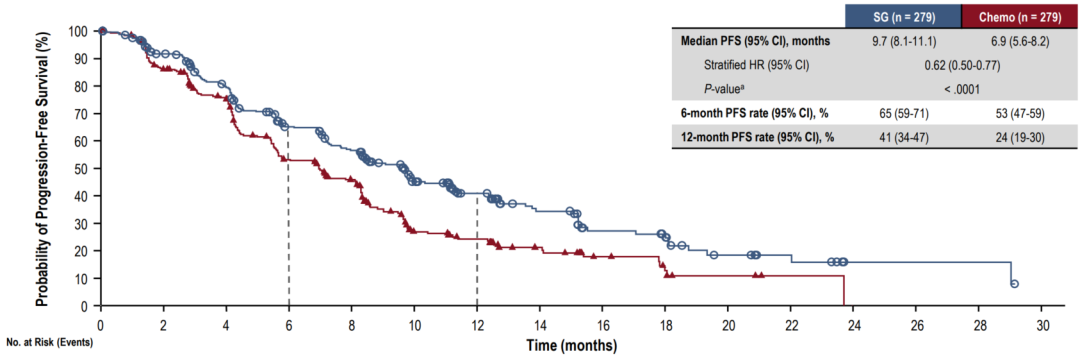 基于上述两项研究,SG无论是否联合免疫治疗,均能较标准治疗方案改善mPFS,达到9.7-11.2个月。在我们的真实世界研究中,以化疗为主的一线治疗方案mPFS为8.0个月,提示以SG为基础的方案相较于传统的化疗方案,能够显示出更长的PFS获益。
