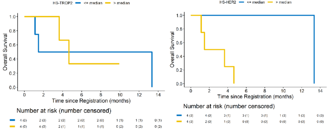 8例患者有TROPLEX数据,其中包括2例肿瘤缓解的患者。所有患者均为HS-Trop2高表达疾病,而仅50%的患者为HS-HER2高表达疾病。在HS-Trop2高于中位数和HS-Trop2低于或等于中位数的患者中各观察到1例LANO缓解,两组的中位颅内PFS分别为4.67个月和4.11个月。同样,在HS-HER2高于中位数和HS-HER2低于或等于中位数的患者中各观察到1例LANO缓解。