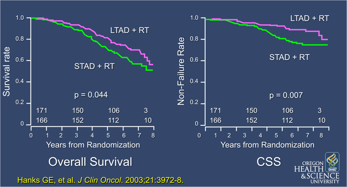 两项研究均证实了局部晚期前列腺癌放疗联合内分泌治疗具有显著的总生存获益,是目前标准的治疗手段。两者在试验设计中的差别在于,EORTC研究的内分泌治疗在放疗第一天就开始,持续三年,而RTOG 85-31的内分泌治疗则在放疗最后一周才开始,持续终生。这种时限和时机的差异也拉开了“如何最优化应用内分泌治疗?”的争论。