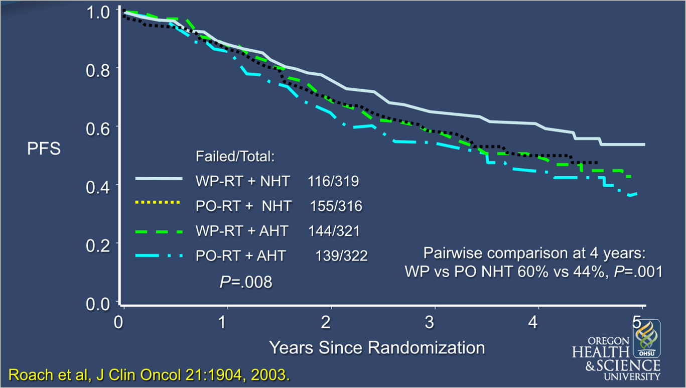 那新辅助和辅助的争论呢?RTOG 9413比较了新辅助和辅助内分泌治疗的差异,然而内分泌治疗的时间仅有4个月。由于这项研究入组的患者均为淋巴结转移高危人群(风险>15%),研究还比较了全盆腔放疗和单纯前列腺放疗的疗效差异。随访的结果显示,短程治疗的情况下,新辅助内分泌治疗+全盆腔放疗的组合能够显著延长淋巴结转移高危患者的无进展生存,有趣的是辅助内分泌治疗联合全盆腔放疗并不优于辅助内分泌治疗联合单纯前列腺放疗。这个结果一方面提示放疗对于淋巴结转移灶的杀伤可以转换为生存获益,同时也证实新辅助内分泌治疗能够起到放疗增敏的效果。