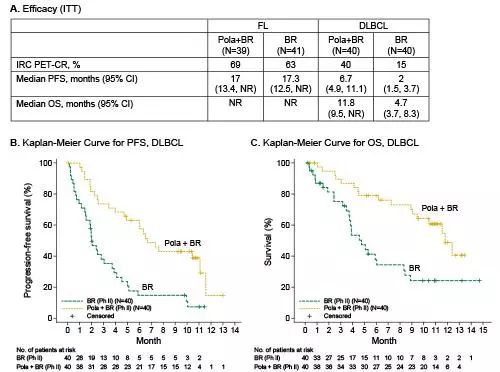 Pola+BR治疗组的毒性如预期的一样,是可控的。在FL患者中,pola+BR治疗组与BR治疗组显示出相似PET评估的CR率。在DLBCL患者中,无论先前的治疗状态如何,与BR治疗组相比,pola+BR组均获得了更高的CR率和显著延长的PFS和OS。
