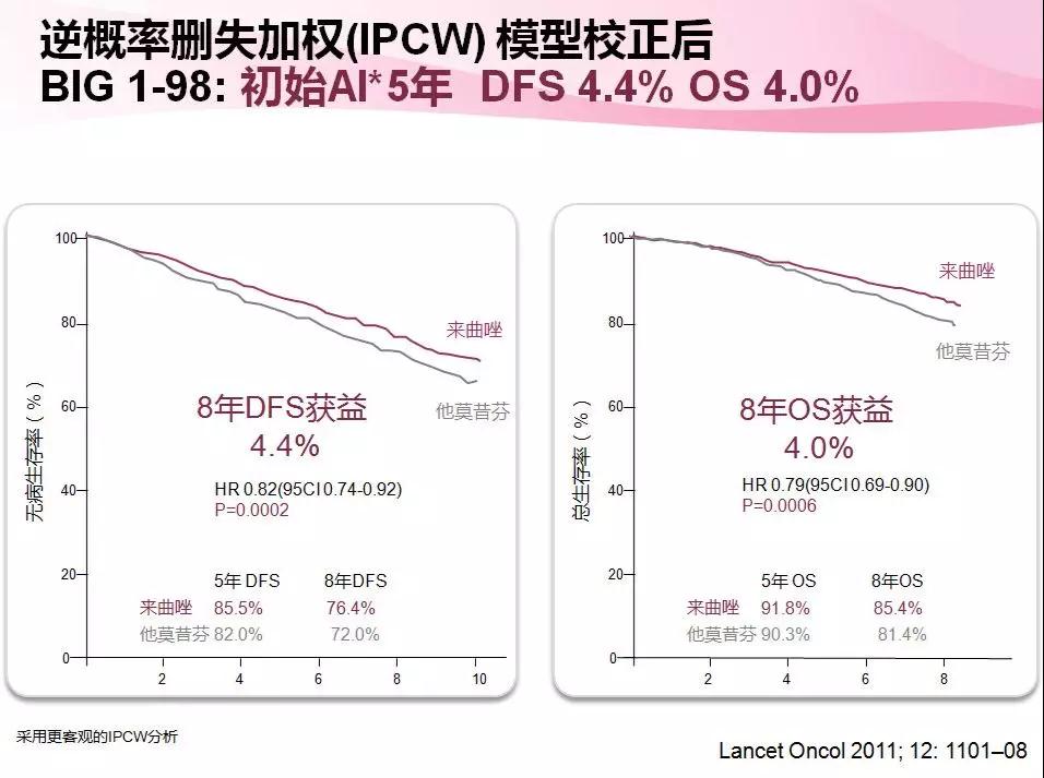 在具体强化策略推荐方面,TEXT和SOFT等临床研究结果提供了很好的循证医学证据,无论复发风险高低,在早期辅助分泌治疗期间联合OFS对降低乳腺癌复发风险有积极意义;而对于中-高危患者,则可考虑以药效更强的“OFS+AI”替代以往的TAM标准5年治疗。也有学者提出,可以推荐AI作为五年内分泌治疗的标准?因为相对于TAM而言,AI可以使患者的无病生存率获得2%以上的绝对获益。BIG1-98,TEXT,TEAM等AI辅助内分泌治疗的重要临床研究中都看到了这一获益趋势;尤其是BIG1-98研究显示,来曲唑是目前随访进程中唯一看到OS获益的AI类药物。