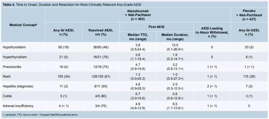 由此可见,Atezolizumab联合白蛋白紫杉醇是可耐受的,与初次发布数据时相比目前没有发现有意义的新事件,没有新的累积剂量毒性或新的或延迟发生的副反应发生。