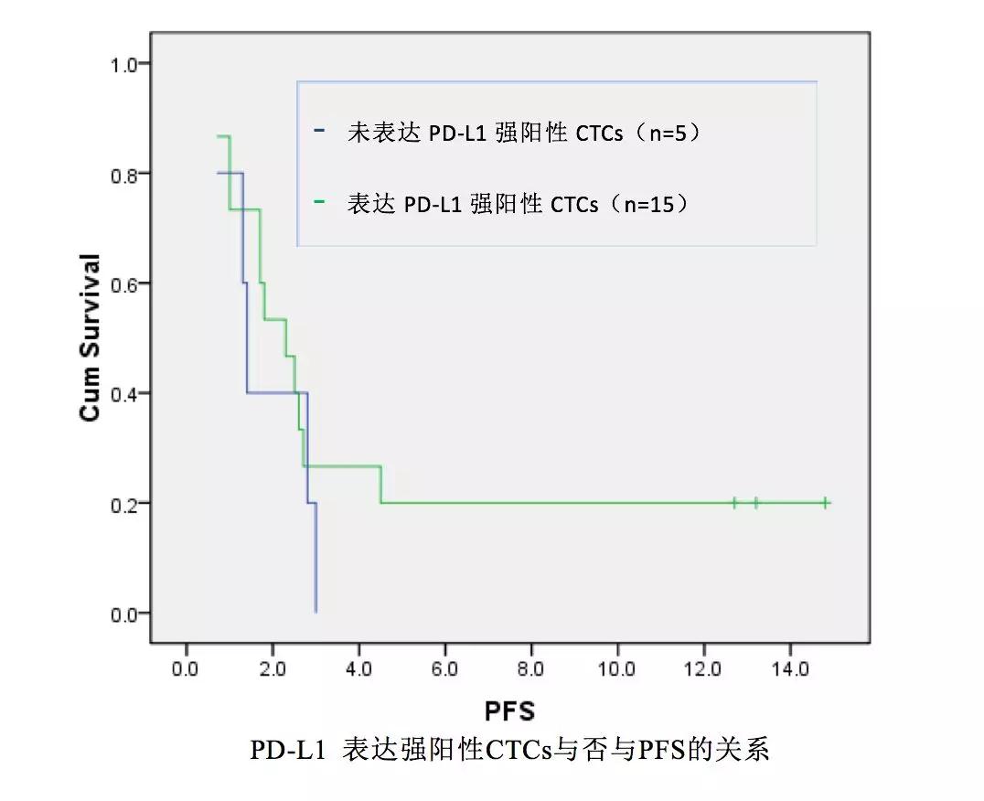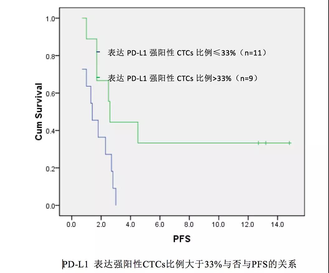 20例入组患者中17例(85%)免疫组化为三阴性,65%的患者存在内脏转移,60%的患者治疗线数≥3线。利用肿瘤捕手技术在95%治疗前患者的外周循环血中检出CTCs(19/20),中位检出个数为5个(范围1-53个),18例患者检出PD-L1表达阳性的CTCs,75%(15/20)的患者至少检出1个PD-L1高表达的CTCs。检出PD-L1高表达CTCs患者的临床获益率(clinical benefit rate,CBR) 为26.7%,明显高于未检出PD-L1高表达CTCs患者的0%。PD-L1高表达CTCs的中位比例为33.3%。基线PD-L1高表达CTCs比例大于33%患者的PFS显著长于对照组(2.6个月 vs 1.4个月,p=0.027)。