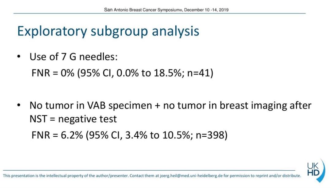 结果显示,ypNO的患者是82%,ypTO的患者48%,FNR达到17.8%,比最初设想的比例要高。分析如此高的FNR的原因可能为37例患者VAB阴性,但最后手术病理证实仍然存在浸润性病灶,其中12例是残留DCIS,20例是<5mm微小残余肿瘤病灶,还有19例患者的肿瘤浸润占比<10%。亚组分析中,如果使用大孔径的7G穿刺针,其活检取得组织量较多则FNR越低,可达到0%。再者,如果VAB和影像学结果均是阴性的,FNR也降低到了6.2%。综上所述,VAB得到残存病灶结果的阳性比率远高于本研究预设;通过VAB精准评估pCR可能还需要进一步的筛选适用人群。