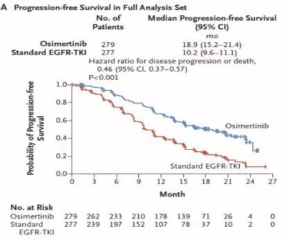 从2014年12月至2016年3月,共计994例患者接受了筛选,其中556例纳入分析(奥希替尼组279例,一代EGFR-TKI组277例)。基线特点均衡可比。前期数据显示,奥希替尼组和一代EGFR-TKI组的ORR分别为80%和76%,DCR分别为97%和92%,缓解深度分别为-54.7%和-48.5%,PFS分别为18.9个月和10.2个月,而对于有CNS转移的患者,奥希替尼组同样显示了更好的疗效(15.2个月 vs. 9.6个月),无CNS转移患者,两组的OS分别为19.1个月和10.9个月。首次分析时,两组的OS均未达到,但曲线分开趋势明显,尽管P=0.007,但低于0.0015的届值水准(多重性分析中,P值校正采用O’Brien–Fleming法)。