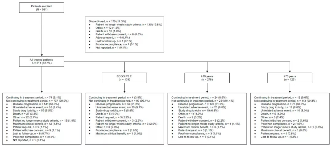所有接受治疗的患者中,12.7%的患者PS评分为2分,分别有34.3%和15.4%的患者年龄≥70岁和75岁,58.6%的患者既往接受至少2种治疗方案。患者基线特点见表2。至数据锁库时,中位随访时间为18个月,9.1%的患者继续接受治疗,包括3.9%的PS评分为2分的患者,8.6%年龄≥70岁和9.6%年龄≥75岁的患者。