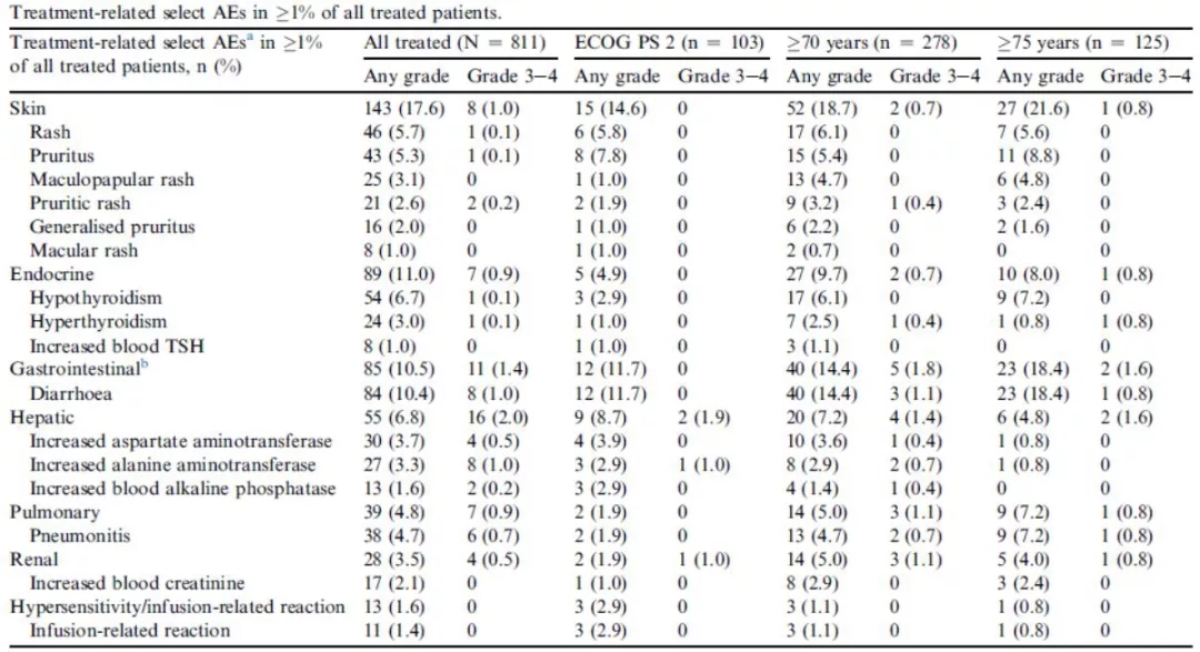任何级别治疗相关的不良反应发生率为57.3%,其中47.6%的患者PS评分2分,分别有62.9%和68.8%的患者年龄≥70岁和75岁。3-4度治疗相关不良反应发生率为13.9%,其中6.8%的患者PS评分2分,分别有15.8%和18.4%的患者年龄≥70岁和75岁。最常见治疗相关不良反应为疲乏(12.2%)、衰弱(10.6%)及腹泻(10.4%),不同亚组间发生率相似。8.3%的患者因治疗相关不良反应导致治疗终止,其中7.8%的患者PS评分2分,分别有9.4%和12.0%的患者年龄≥70岁和75岁。