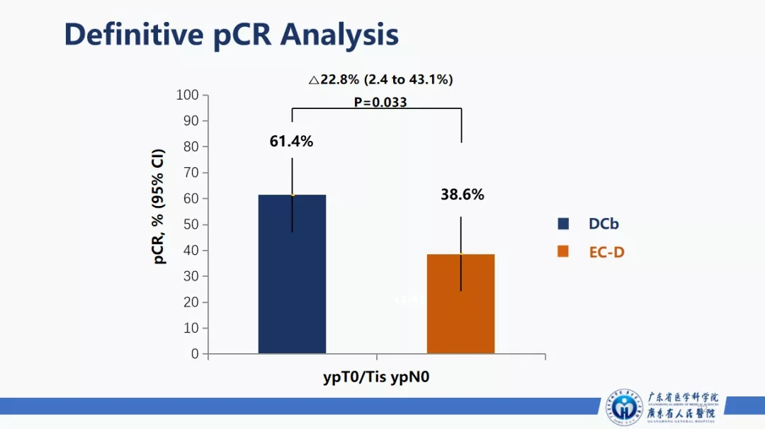 研究从2016年4月开始入组至2019年12月入组结束,试验组6周期DCb(多西他赛+卡铂)方案的总pCR率为61.4%(95%CI:47.0~75.8),相较于对照组4EC-4D的38.6%(95%CI:24.3~53.0)提高了22.8%(OR=2.52,95%CI:2.4~43.1;P=0.033)(图1)。在不良反应的分析中,使用卡铂带来了更多的血小板减少,但集中在1-2度;而4EC-4D组有更多的中性粒细胞减少的发生。