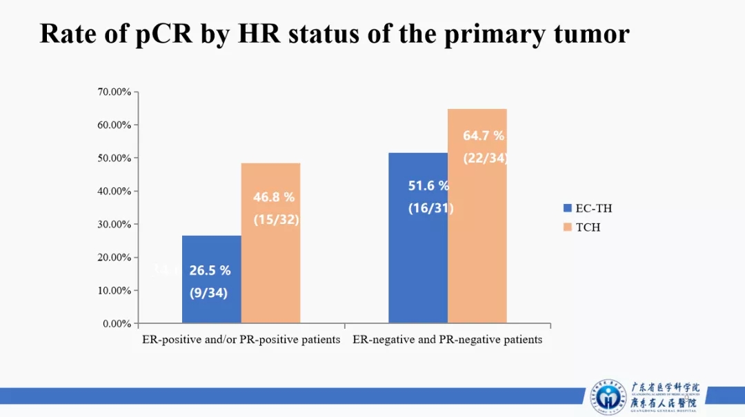 从2016年9月开始至2019年11月入组研究结束,共131例患者纳入研究分析。试验组6周期TCH(多西他赛+卡铂+赫赛汀)方案的总pCR率为56.1%(37/66)(95%CI:44.1–68.0),显著高于对照组4EC-4TH(4周期表柔比星+环磷酰胺,序贯4周期多西他赛+赫赛汀)的38.5%(25/65)(95%:CI 26.6~50.2)(P=0.044)(图2)。在不良反应的分析中,4EC-4TH有更高比例的中性粒细胞减少,而6TCH组有更高比例的贫血和血小板下降的发生。