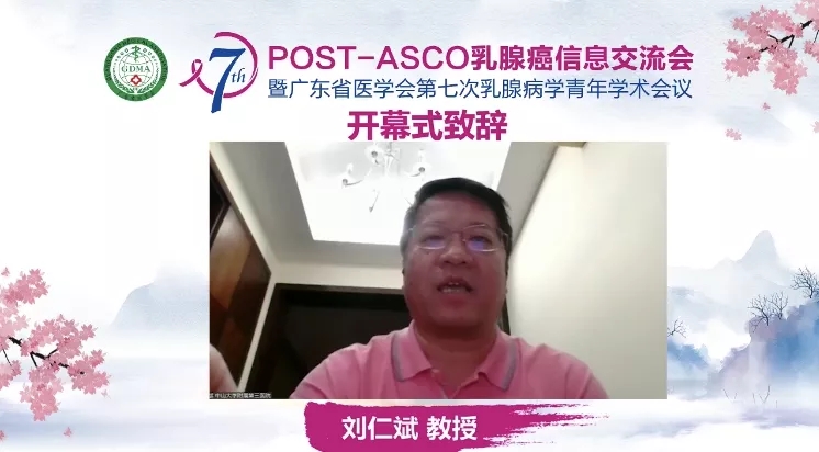 名誉主席中山大学附属第三医院刘仁斌教授表示:很开心第七届POST-ASCO乳腺癌信息交流会如期举行。疫情之下,学术不停止,为了让大家及时了解到最新的乳腺癌信息的更新,广东省医学会青年委员会在广东省人民医院王坤教授、中山大学孙逸仙纪念医院姚和瑞教授领导下,前期做了大量的准备工作,采取线上与线下结合,确保了会议如期举行,相信今天的会议会给大家带来更多的收获,预祝会议圆满成功。