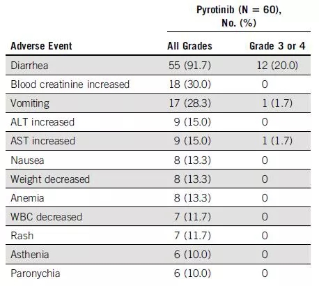 当前,NCCN指南仅把TDM-1作为HER2突变的晚期NSCLC治疗的2A类推荐。在晚期肺癌中,HER2突变约占1%~4%,但这部分患者并没有相应的靶向治疗。吡咯替尼是一款针对HER1/2及HER4的小分子酪氨酸激酶抑制剂。基于前期研究,吡咯替尼联合卡培他滨已经被批准用于HER2阳性的转移性乳腺癌患者,本研究旨在探索吡咯替尼在HER2突变的晚期肺癌患者中的疗效及安全性。