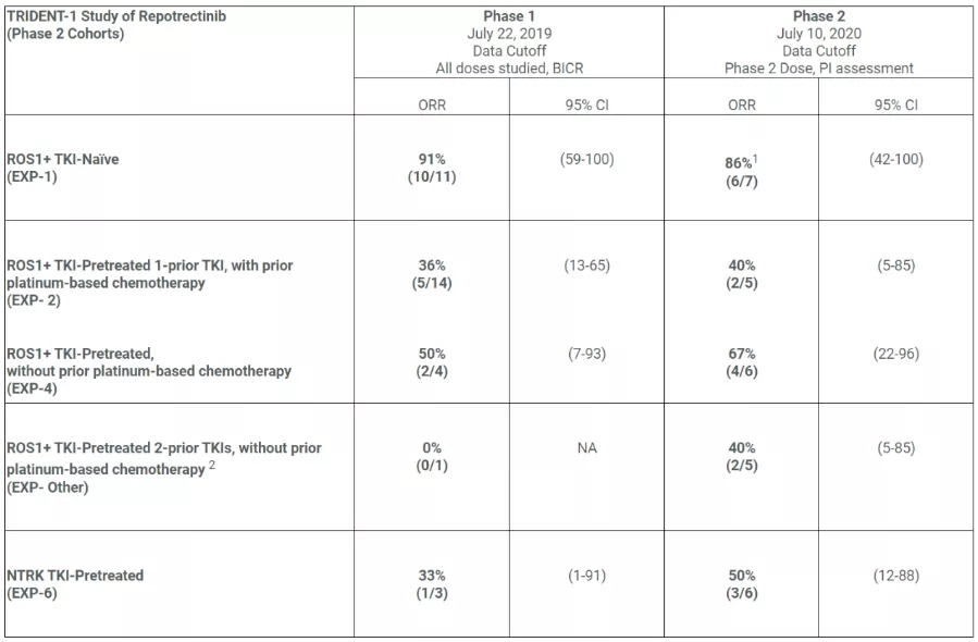 在ROS1阳性,接受过一次前期TKI治疗,并且接受过化疗的NSCLC患者中,ORR达到40%(2/5)。在5例先前接受过2种TKIs治疗、未接受化疗的ROS1阳性NSCLC患者中,其中2例患者对repotrectinib产生了CR,ORR为40%,两名CR患者在数据截止时持续产生治疗反应1.9个月以上。
