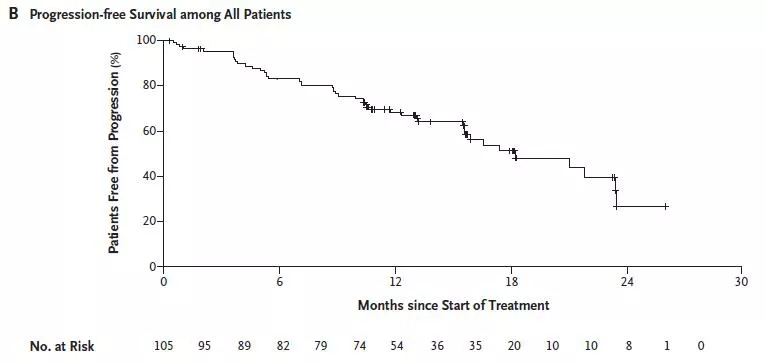 中位PFS为18.4个月,1年的PFS率为68%(图3)。