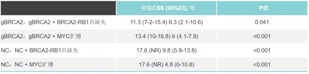 gBRCA2突变与CSS独立相关(HR 3.70;P=0.008)。存在体细胞BRCA2-RB1编码或MYC扩增的gBRCA2携带者,其CSS相较于不存在此类改变的gBRCA2携带者更短。在非gBRCA2携带者中观察到类似的结果(表)。MVA模型证实了体系BRCA2-RB1编码(HR=4.13;P=0.004)和MYC扩增(HR=2.27;P=0.033)对CSS的独立预后价值。