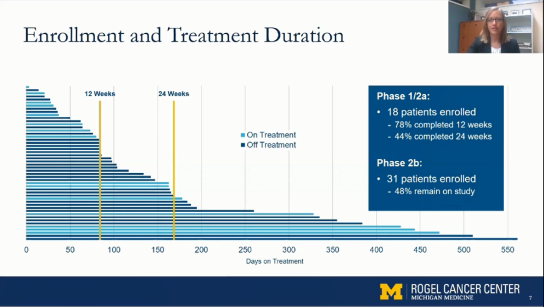 共纳入49例患者,包括49%PMF,36%PET-MF,15%PPV-MF。中位年龄是68(范围34-88)岁。IPSS评分中危占45%,高危占55%。男性占55%,女性占45%。I/IIa期共18入组例患者,78%完成了12周,44%完成了24周;