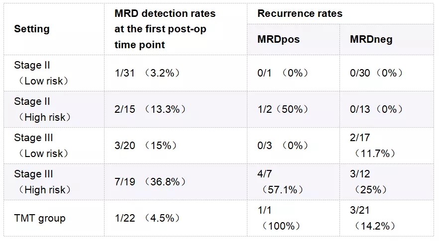 值得注意的是,如果出现高危特征,以及疾病分期越晚期,手术后ctDNA的发现比例就越高:R0切除术后,低风险Ⅱ期结直肠癌患者中发现ctDNA的比例为3.2%,高危Ⅱ期结直肠癌患者为13.3%,低风险Ⅲ期结直肠癌患者为15.0%,高危Ⅲ期结直肠癌患者为36.8%。
