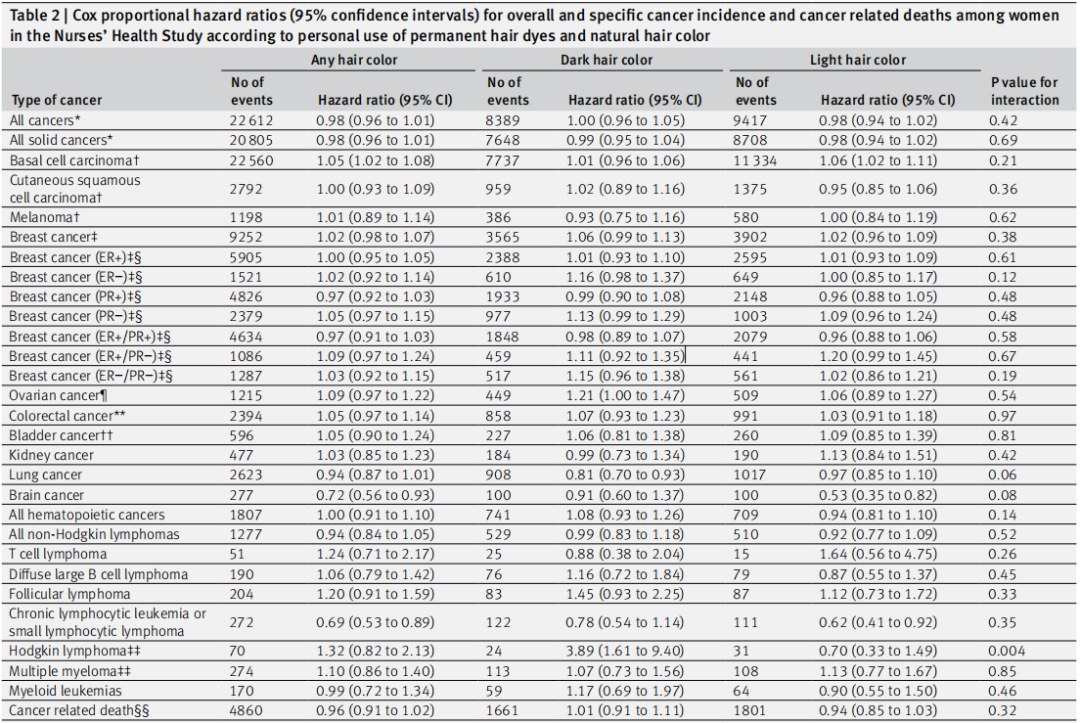 在36年的随访中,研究者发现长期染发剂使用者患实体癌(n=20805,不包括非黑色素瘤皮肤癌;HR=0.98,95%CI:0.96~1.01)或血液系统癌症(n=1807;HR=1.00,95%CI:0.91~1.10)的风险没有显著增加。此外,曾经的使用者没有增加患大多数特定癌症的风险(皮肤鳞状细胞癌、膀胱癌、黑色素瘤、雌激素受体阳性乳腺癌、孕激素受体阳性乳腺癌、激素受体阳性乳腺癌、脑癌、结直肠癌、肾癌、肺癌和大多数癌症,造血细胞癌的主要亚型和组织学亚型)或与癌症相关死亡(n=4860;HR=0.96,95%CI:0.91~1.02)。基底细胞癌的风险在使用过的人群中略有增加(n=22560;HR=1.05,95%CI:1.02~1.08)。累积剂量与雌激素受体阴性乳腺癌、孕激素受体阴性乳腺癌、激素受体阴性乳腺癌和卵巢癌的风险呈正相关。只有自然深色头发的女性(70名女性,24名深色头发的女性)患霍奇金淋巴瘤的风险增加,而自然浅色头发的女性患基底细胞癌的风险更高。