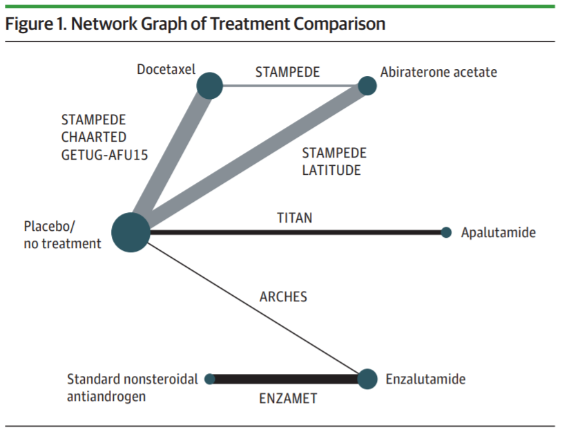 Wang L, Paller CJ, Hong H, De Felice A, Alexander GC, Brawley O. Comparison of Systemic Treatments for Metastatic Castration-Sensitive Prostate Cancer: A Systematic Review and Network Meta-analysis [published online ahead of print, 2021 Jan 14]. JAMA Oncol. 2021;10.1001/jamaoncol.2020.6973. doi:10.1001/jamaoncol.2020.6973