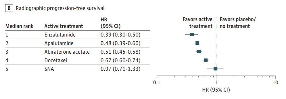 多西他赛与改善rPFS相关的治疗依次是恩扎卢胺(HR 0.39;95%CI:0.30~0.50)、阿帕鲁胺(HR 0.48;95%CI:0.39~0.60)、醋酸阿比特龙(HR 0.51;95%CI:0.45~0.58)和多西他赛(HR 0.67;95%CI:0.60~0.74)。