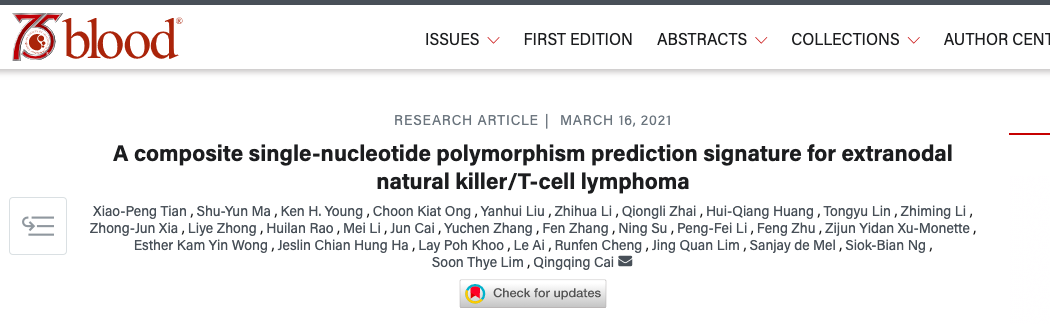 2021年3月16日,中山大学肿瘤防治中心内科蔡清清教授课题组在国际血液学期刊Blood上发表了题为“A composite single-nucleotide polymorphism prediction signature for extranodal natural killer/T-cell lymphoma patients undergoing non-anthracyline-based treatment: a retrospective, international, cohort study”的文章(DOI:10.1182/blood.2020010637)。蔡清清教授为唯一通讯作者,中山大学肿瘤防治中心田小朋副研究员、马淑云博士,美国杜克大学Ken H. Young教授,新加坡国立癌症中心Choon Kiat Ong教授,广东省人民医院刘艳辉教授为共同第一作者。蔡清清教授牵头该国际多中心研究创建ENKTL单核苷酸多态性(Signal nucleotide polymorphism, SNP)预后评价系统,修正了肿瘤异质性及活检取材部位的偏差,作为有效工具个体化预测ENKTL患者预后,可用于指导早期高危患者接受联合放化疗。该评价系统可为不同预后风险的ENKTL患者指导精准治疗决策。