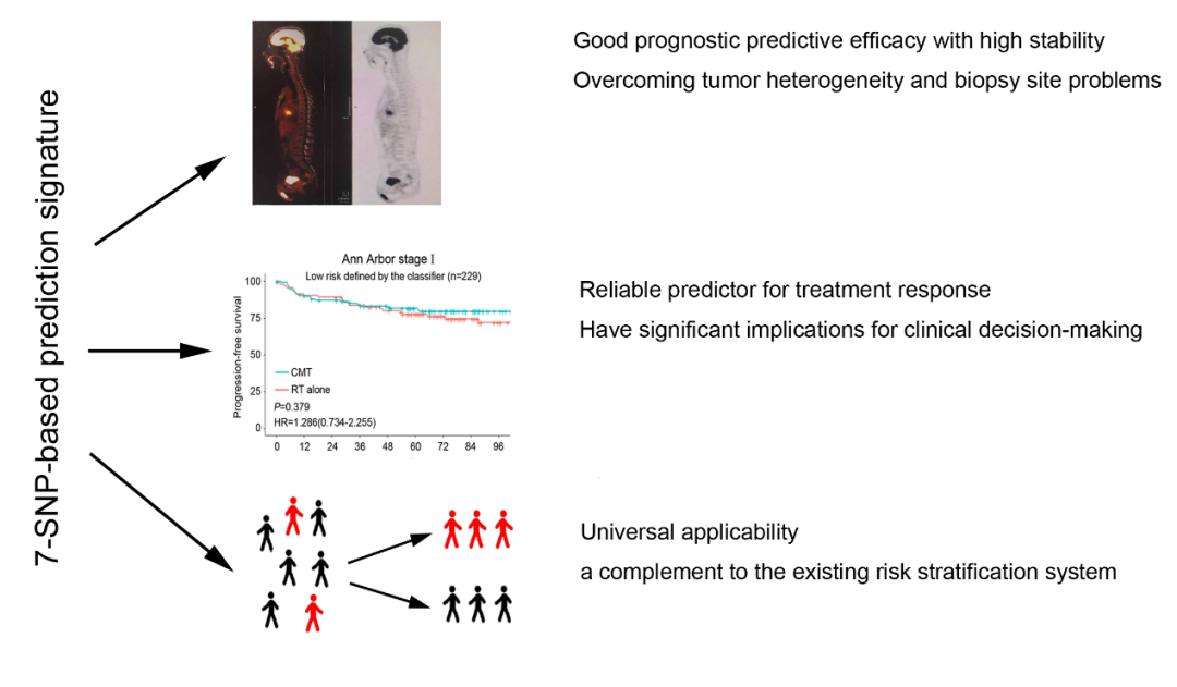 在这项国际回顾性多中心队列研究中,首先使用高通量SNP芯片鉴定出与生存相关的36个SNP位点。进一步采用LASSO回归模型构建了一个基于7个SNP的预测模型,可准确计算出个体化预后风险评分,该SNP预测模型在其他国内及国际队列中也具有较高的预后预测效能,且其预测效能不受肿瘤样本类型及肿瘤异质性影响,可作为当前IPI、KPI及PINK等预后系统的补充。