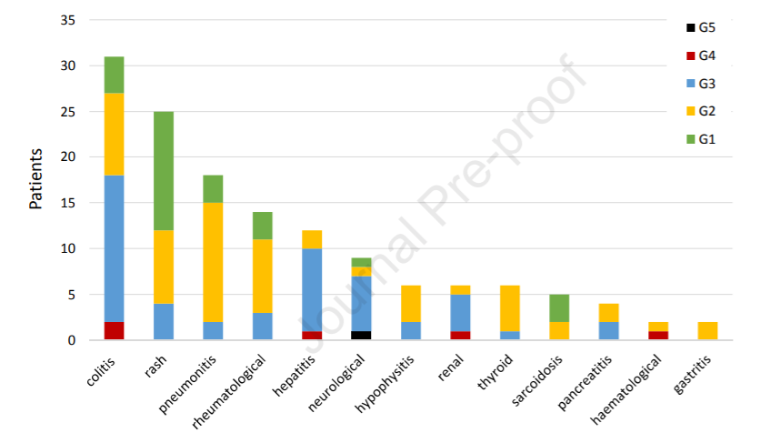55例(39%)irAE≥G3。80名患者(68%)需要激素治疗,27名患者(23%)需要免疫抑制剂治疗。有两例与irAE相关死亡:1例在抗PD-1治疗期间发生脑炎死亡,1例在停用抗PD-1治疗11个月后发生多脏器衰竭死亡。