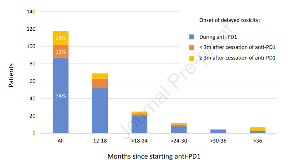 免疫相关不良事件(irAE)通常发生在免疫检查点抑制剂(抗PD-1±抗CTLA4)治疗开始后的4个月内,但也可能发生迟发性irAE(开始治疗后>12个月)。这项多中心的回顾性研究描述了接受抗PD-1免疫治疗的患者中迟发性irAE的发生率、程度和处理。