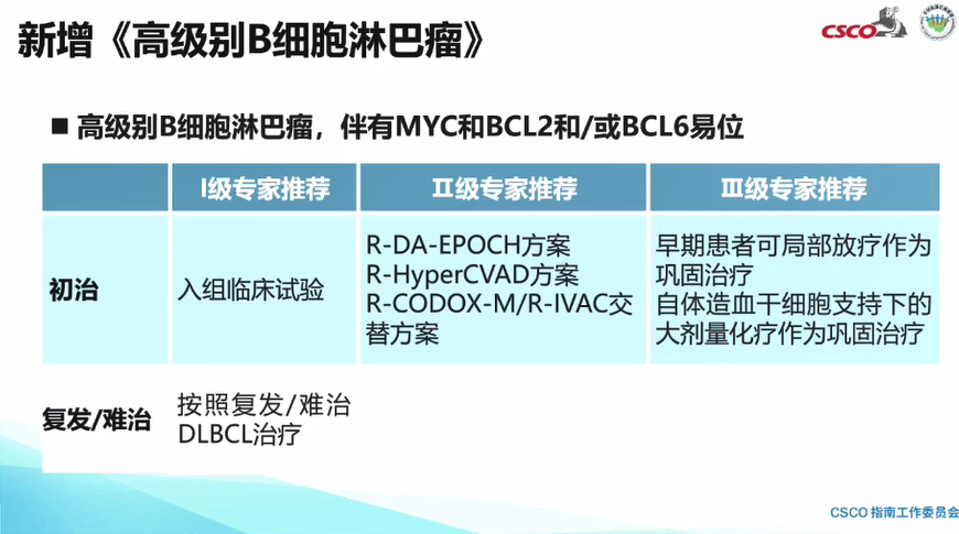 高级别B细胞淋巴瘤的治疗:高级别B细胞淋巴瘤侵袭性强且预后较差,当前对于初治患者的Ⅰ级专家推荐为入组临床试验;Ⅱ级专家推荐可选择R-DA-EPOCH方案,以及强度更高的R-HyperCVAD、R-CODOX-M/R-IVAC交替方案;Ⅲ级专家推荐早期患者可考虑局部放疗作为巩固治疗,此外,也可采用自体造血干细胞支持下的大剂量化疗作为巩固治疗。对于复发/难治的高级别B细胞淋巴瘤患者,由于没有更多的循证医学依据,因此推荐按照复发/难治DLBCL患者常规诊疗方案进行治疗。