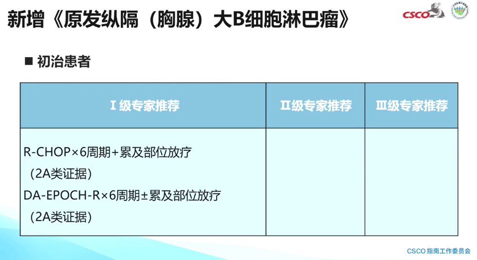 原发纵膈(胸腺)大B细胞淋巴瘤的治疗:对于初治患者Ⅰ级专家推荐为R-CHOP×6周期+累及部位放疗,有条件的医学中心可以选择DA-EPOCH-R×6周期±累及部位放疗。由于缺少更多的循证医学依据,因此没有给予Ⅱ级/Ⅲ级专家推荐。对于复发/难治的原发纵膈(胸腺)大B细胞淋巴瘤患者,韩为东教授团队开展的一项卡瑞利珠单抗联合GVD化疗的研究在此方面取得重要突破,因此也被纳入当前指南中。