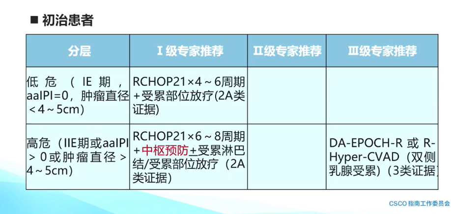 原发乳腺弥漫性大B细胞淋巴瘤的治疗:初治患者需进行分层。低危患者(ⅠE期,aaIPI=0,肿瘤直径<4~5cm),Ⅰ级专家推荐为R-CHOP21×4~6周期+受累部位放疗,高危患者(ⅡE期或aaIPI>0或肿瘤直径>4~5cm),Ⅰ级专家推荐为R-CHOP21×6~8周期+中枢预防(需特别注意)±受累淋巴结/受累部位放疗,有条件的中心Ⅲ级专家推荐为DA-EPOCH-R方案或R-Hyper-CVAD方案。