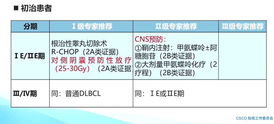 原发睾丸弥漫性大B细胞淋巴瘤的治疗:初治患者中,ⅠE/ⅡE期患者Ⅰ级专家推荐为根治性睾丸切除术联合R-CHOP方案,以及对侧阴囊预防性放疗。此外也积极推荐患者进行CNS预防,如鞘内注射甲氨蝶呤±阿糖胞苷,或静脉给予大剂量甲氨蝶呤化疗(2个疗程)。对于Ⅲ/Ⅳ期原发睾丸弥漫性大B细胞淋巴瘤的治疗目前还是类同于普通DLBCL的治疗,并且同样特别强调进行CNS预防。