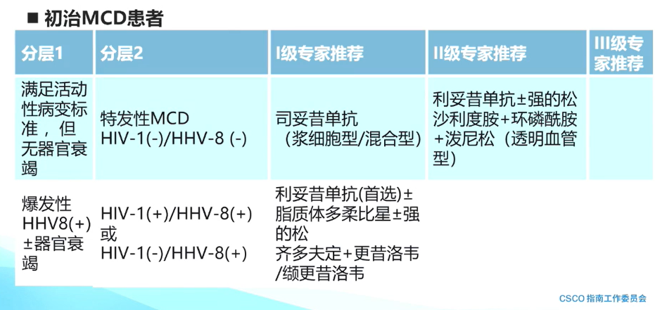 新增《Castleman病》章节主要针对初治MCD患者。对于满足活动性病变标准,但无器官衰竭的患者,若为特发性MCD以及HIV-1(-)/HHV-8(-),Ⅰ级专家推荐为司妥昔单抗(浆细胞型/混合型Castleman病),Ⅱ级专家推荐为利妥昔单抗±强的松沙利度胺+环磷酰胺+泼尼松(主要用于透明血管型Castleman病)。对于爆发性HHV8(+)±器官衰竭患者,如HIV-1(+)/HHV-8(+)或HIV-1(-)/HHV-8(+)类型,可以考虑利妥昔单抗(首选)±脂质体多柔比星±强的松方案,需要特别强调的是,这部分患者需进行抗病毒治疗,方案可以为齐多夫定+更昔洛韦/缬更昔洛韦。