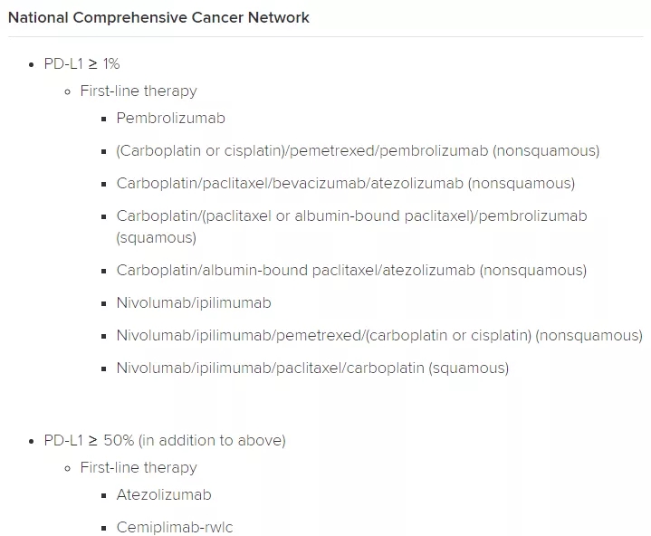 纳武利尤单抗-伊匹木单抗也是晚期NSCLC免疫治疗方案之一。在CheckMate-227试验中,纳武利尤单抗-伊匹木单抗已被证明优于化疗,这导致FDA于2020年5月批准了PD-1单抗纳武利尤单抗联合CTLA-4单抗伊匹木单抗用于肿瘤细胞PD-L1表达≥1%且无 EGFR /ALK变异的转移性NSCLC。目前还不清楚为什么使用这种方案而不是化疗联合帕博利珠单抗。但一线使用纳武利尤单抗-伊匹木单抗,就保留疾病进展后患者仍有含铂双药化疗的选择。一些研究人员和使用过该方案的肿瘤学家认为,使用纳武利尤单抗-伊匹木单抗为基础的治疗方案,患者可能获得最长、最强劲的治疗反应。但这一点还没有得到澄清或证实。