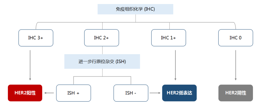 在HER2表达的判读上,2021版共识新增加HER2低表达的判读,定义为:IHC 1+或IHC 2+且ISH-。鉴于HER2蛋白低表达及阳性表达对于患者治疗及预后有重要意义,建议在每次染色过程中都加入阳性和阴性对照。