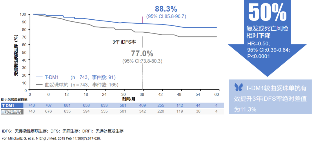 但早期HER2阳性乳腺癌患者经PH双靶新辅助治疗后,仍有约30%~60%的患者被评估为有残留病灶(non-pCR)。对于这部分患者的后续治疗,KATHERINE研究进行了探索,中位随访41个月,T-DM1组3年iDFS率为88.3%,曲妥珠单抗组为77.0%,两组绝对差异达11.3%。ITT人群疾病复发或死亡风险显著降低50%。而中国人群iDFS获益与ITT人群一致(83.8% vs. 70.4%),T-DM1组较曲妥珠单抗组3年iDFS率绝对差值为13.4%。T-DM1组疾病复发、死亡风险较曲妥珠单抗组降低43%,与全球ITT人群获益类似。