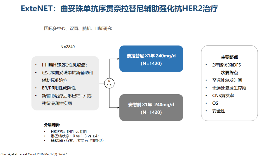 2、1年曲妥珠单抗辅助治疗后序贯奈拉替尼强化治疗,辅助双靶向治疗后也可考虑奈拉替尼后续强化治疗。