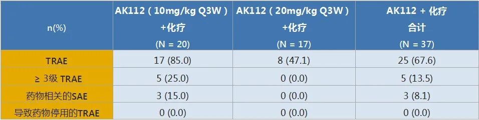 至数据截止日期,研究共入组了37例初治NSCLC受试者接受AK112联合化疗(紫杉醇+卡铂或培美曲塞+卡铂)治疗。