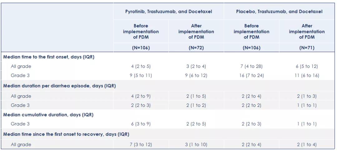 吡咯替尼是不可逆、泛-ErbB受体,靶向HER1、HER2和HER4的TKI,腹泻是其不良反应之一。多西他赛本身就有一定的致泻性,再联合吡咯替尼后患者的腹泻发生率会有所增高。PHEDRA研究初期发现3级及以上的腹泻发生率高达40%,针对这个情况我们在研究中期进行了治疗管理方案的调整,制定了PDM,选择洛哌丁胺作为抗腹泻药物并严格按照洛哌丁胺的推荐剂量进行应用,并对实施PDM前后腹泻的发生率,严重程度,持续时间等进行描述性总结分析。
