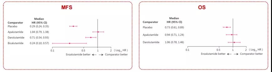 目前还没有头对头比较的研究,但已有一些基于临床研究数据的间接比较。2021年ASCO-GU报道的一项网络荟萃分析,比较了PROSPER、SPARTAN、ARAMIS和STRIVE等关键研究的数据显示,恩扎卢胺相较于比卡鲁胺、达罗他胺有显著的MFS和TTPP延长,但三种新型AR抑制剂的OS没有显著差异。