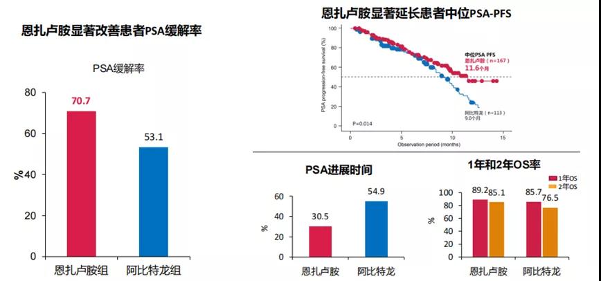 恩扎卢胺、阿比特龙等新型内分泌治疗进入mCRPC临床实践后,在真实世界中已经积累了丰富的数据。北京大学第一医院何志嵩教授总结了亚洲mCRPC人群新型内分泌治疗的生存获益和安全性。一项利用中国台湾NHIRD数据的真实世界研究显示,恩扎卢胺相比阿比特龙的OS获益更佳(总死亡率:40.55% vs 53.7%,P=0.0004),且新发合并症无明显差异;一项来自我国香港7个肿瘤中心的真实世界数据则显示,恩扎卢胺用于一线治疗的生存获益更好(1、2、3/4线OS:18.6、15.8、7.4个月),而后线治疗的不良事件发生率比一线治疗更高;日本神户大学和滨松大学的研究人员总结了280例化疗前使用恩扎卢胺或阿比特龙一线治疗的数据显示,恩扎卢胺组的PSA缓解率更高(70.7% v s53.1%)、中位PSA-PFS更长(11.6 vs 9.0个月)、2年OS率更高(85.1% vs 76.5%)。
