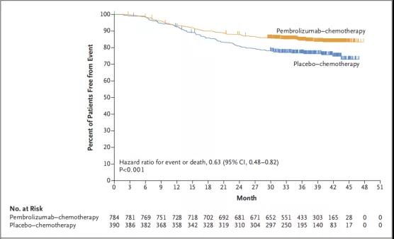 共计1174例患者被随机分配至帕博利珠单抗-化疗组(784例患者)或安慰剂-化疗组(390例患者)(意向治疗人群)。第4次中期分析中(数据截止日期为2021年3月23日),中位随访时间为39.1个月(范围为30.0~48.0)。在两个治疗组中,治疗暴露的中位时间和化疗剂量的中位数量相似。