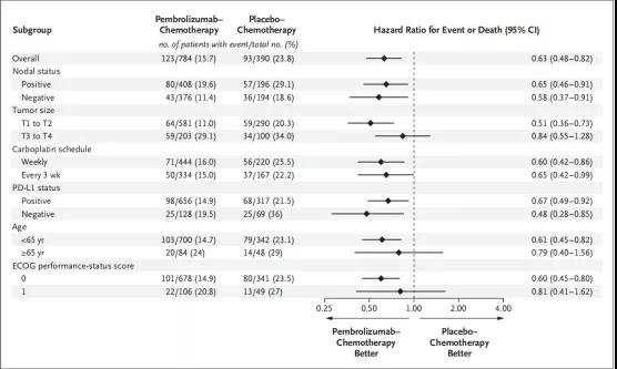 根据病理完全缓解(ypT0 Tis ypN0)的结果进行的无事件生存期探索性分析表明,在达到pCR的人群中,帕博利珠单抗-化疗组494例患者中有27例(5.5%)发生事件或死亡,安慰剂-化疗组217例患者中有16例(7.4%)发生事件或死亡(HR=0.73;95%CI:0.39~1.36)。在没有达到pCR的人群中,帕博利珠单抗-化疗组290例患者中有96例(33.1%)发生事件或死亡,安慰剂-化疗组173例患者中有77例(44.5%)发生事件或死亡(HR=0.70;95%CI:0.52~0.95)。