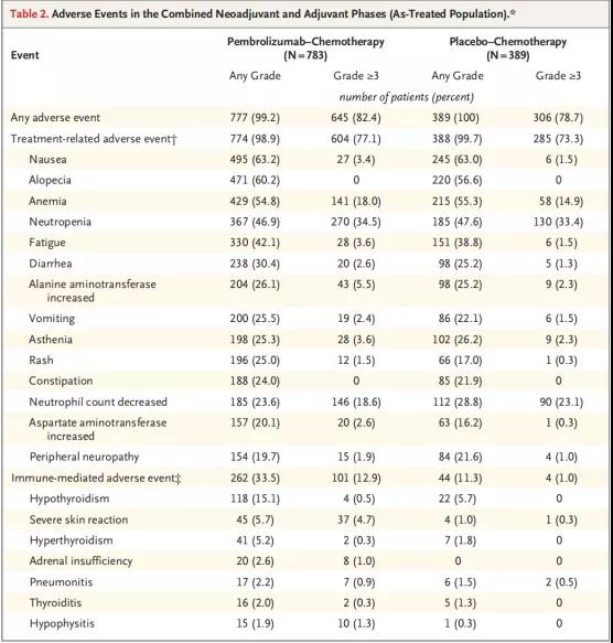 帕博利珠单抗-化疗组34.1%的患者和安慰剂-化疗组20.1%的患者发生了治疗相关严重不良事件。治疗相关不良事件导致帕博利珠单抗-化疗组4例患者(0.5%)和安慰剂-化疗组1例患者(0.3%)死亡。大多数治疗相关不良事件发生在新辅助治疗阶段,而不是辅助治疗阶段。
