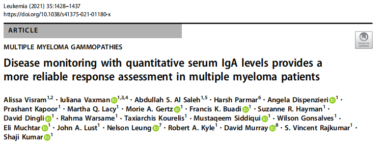 编者按:与IgG型单克隆免疫球蛋白(MCP)不同,IgA型MCP的定量并不可靠,这是因为血清蛋白电泳(SPEP)上IgA型MCPs的迁移存在其他因素的干扰。基于国际骨髓瘤工作组(IMWG)专家共识和当前的研究表明, 浊度定量IgA(qIgA)在监测IgA型多发性骨髓瘤(MM)中具有较重要的价值,但其应用地位尚不清楚,需要进一步的深入探索。针对该问题, 2021年Leukemia期刊上发表了一项研究, 分别比较了SPEP测量MCP以及IgA定量(qIgA)两种方法在IgA型MM患者疾病治疗反应评估中的价值,其结果证实了qIgA对于IgA型MM患者治疗反应评估、生存预测和间接改善预后方面具有重要作用。欲知研究详情,且看下文……