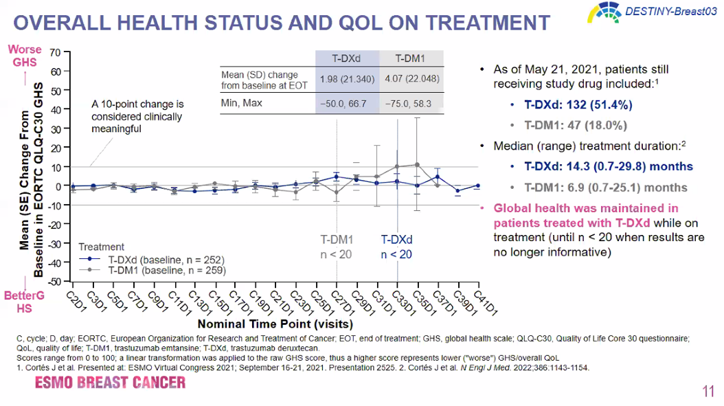 研究结论:既往报告的数据显示T-DXd改善了疗效并有可控的毒性,结合本次QoL维持或改善的数据,进一步表明T-DXd在HER2+MBC患者治疗中的总体获益良好。