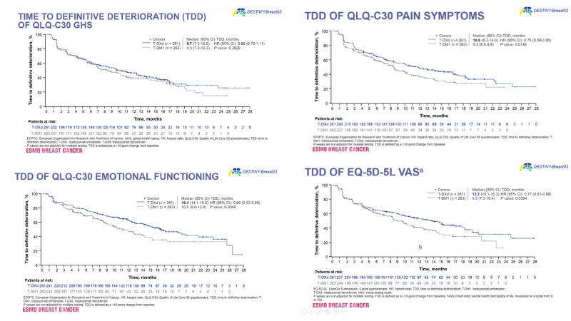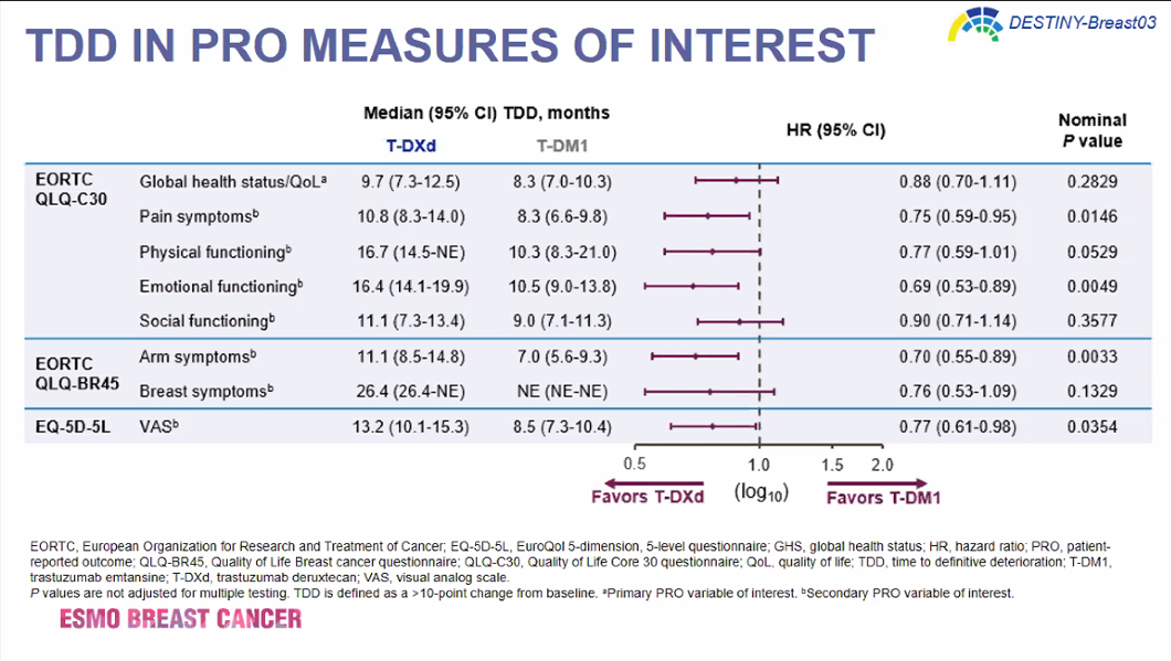 从本次ESMO BC会议上的数据我们可以总结出:T-DXd组治疗患者维持了总体健康状况和QoL水平,基于EORTC QLQ-C30 GHS量表(关注的主要PRO变量)和其他特定关注的子量表较基线的平均变化情况如下:T-DXd组14.3个月的中位治疗持续时间长于T-DM1组的6.9个月,对于所有预先设定的需要关注的PRO变量,TDD HR在数值上支持T-DXd优于T-DM1(HR范围:0.69~0.90)。表明T-DXd治疗可延迟mBC患者的QoL恶化。T-DXd的疼痛症状TDD延迟(HR,0.75)尤其显著,因为其对QoL有深远影响。