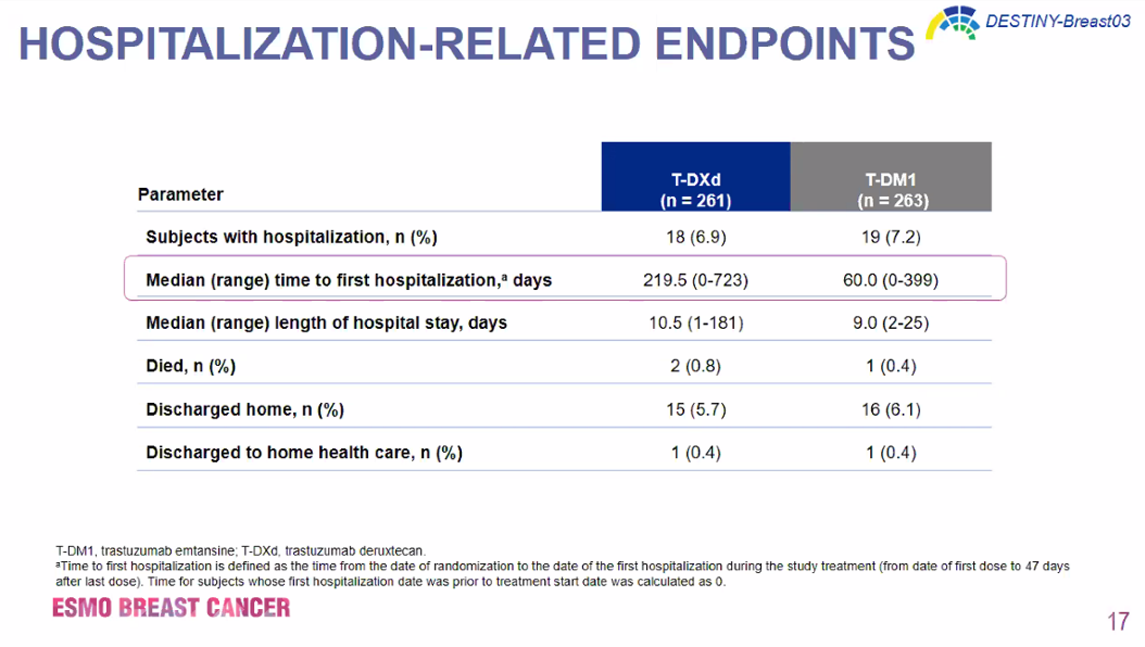 T-DXd与T-DM1相比,延迟了至首次住院时间:中位数分别为219.5天和60.0天(两组的住院率均较低),且相关证据还表明,T-DXd治疗期间QoL得以维持且各预先规定的量表中的恶化相比T-DM1组延迟。这进一步支持T-DXd相比T-DM1可改善疗效(包括更优的PFS)和可控的安全性特征,从而支持T-DXd作为HER2+mBC患者的标准治疗。
